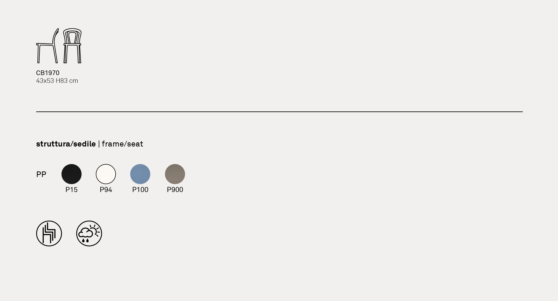 Sedia realizzata in polipropilene, impilabile, adatta anche ad uso esterno.